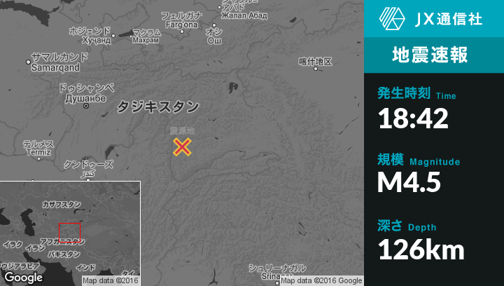 9月20日 18:42頃、タジキスタンのShughnonから北東26kmの地点でM4.5の地震がありました。