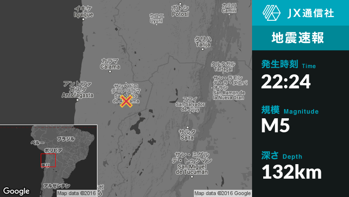| 震源地 | チリのSan Pedro de Atacamaから南73kmの地点 |