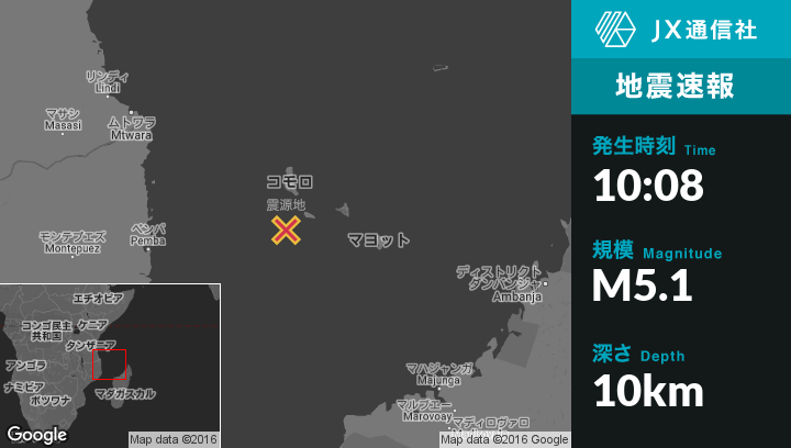 9月21日 10:08頃、コモロのNioumachouaから西南西50kmの地点でM5.1の地震がありました。