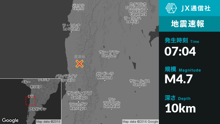 9月22日 07:04頃、チリのSalamancaから東30kmの地点でM4.7の地震がありました。