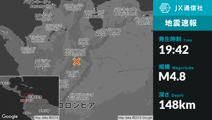 9月22日 19:42頃、コロンビアのPiedecuestaから南南東11kmの地点でM4.8の地震がありました。