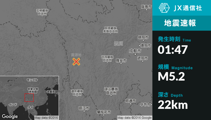 9月23日 01:47頃、中国のRulongから南西102kmの地点でM5.2の地震がありました。
