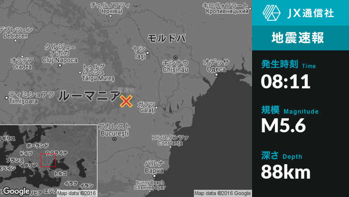9月24日 08:11頃、ルーマニアのNerejuから西7kmの地点でM5.6の地震がありました。