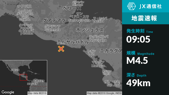 9月24日 09:05頃、エルサルバドルのAcajutlaから南南東41kmの地点でM4.5の地震がありました。