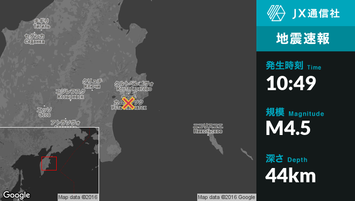 9月24日 10:49頃、ロシアのUst'-Kamchatsk Staryyから南18kmの地点でM4.5の地震がありました。