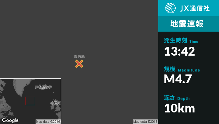 9月24日 13:42頃、グリーンランドのNanortalikから東南東762kmの地点でM4.7の地震がありました。