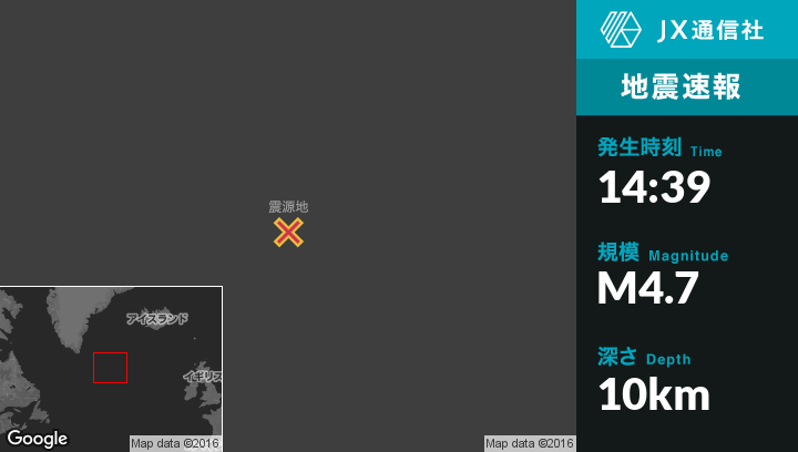 9月24日 14:39頃、グリーンランドのNanortalikから東南東747kmの地点でM4.7の地震がありました。