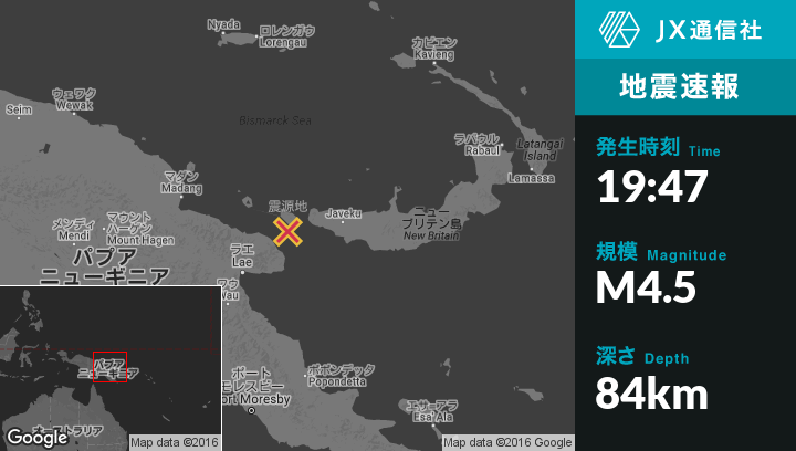 9月24日 19:47頃、パプア ニューギニア独立国のFinschhafenから北89kmの地点でM4.5の地震がありました。