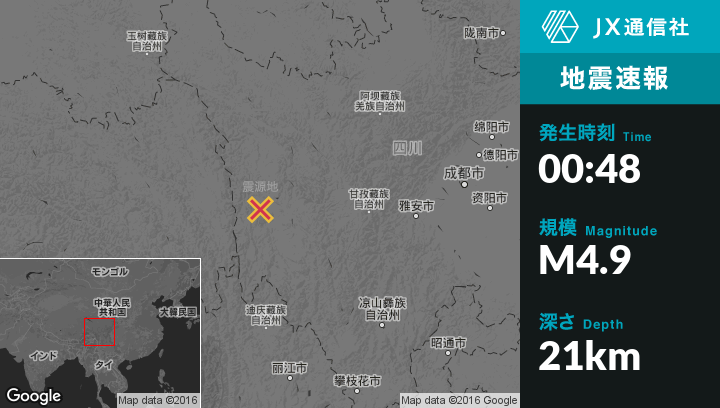 9月27日 00:48頃、中国のRulongから南西106kmの地点でM4.9の地震がありました。