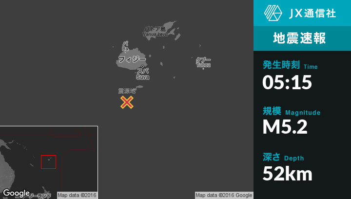 9月27日 05:15頃、フィジーのSuvaから南南西170kmの地点でM5.2の地震がありました。