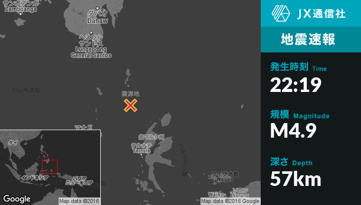 9月27日 22:19頃、インドネシアのTobeloから北西193kmの地点でM4.9の地震がありました。
