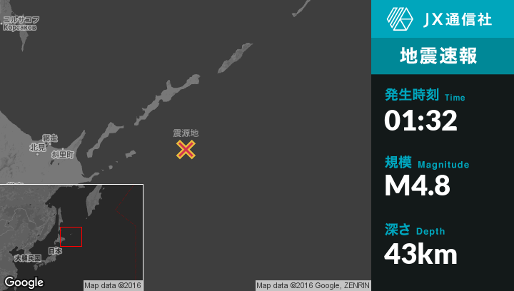9月29日 01:32頃、ロシアのShikotanから東139kmの地点でM4.8の地震がありました。
