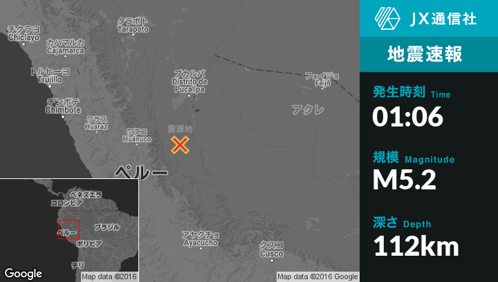 10月06日 01:06頃、ペルーのOxapampaから北北東101kmの地点でM5.2の地震がありました。