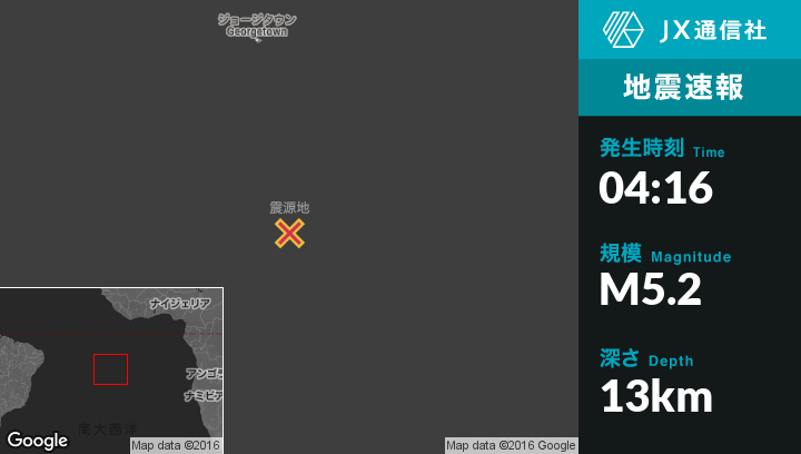 10月27日 04:16頃、セントヘレナのGeorgetownから南408kmの地点でM5.2の地震がありました。
