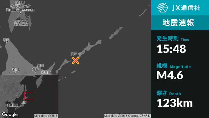 10月27日 15:48頃、ロシアのShikotanから北79kmの地点でM4.6の地震がありました。