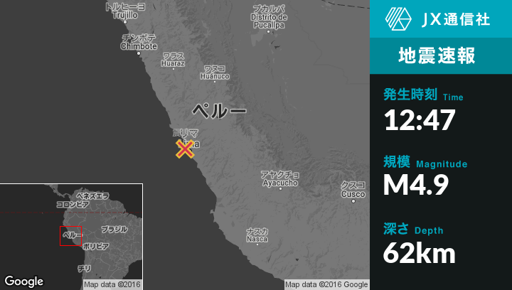 10月28日 12:47頃、ペルーのIndependenciaから北西21kmの地点でM4.9の地震がありました。