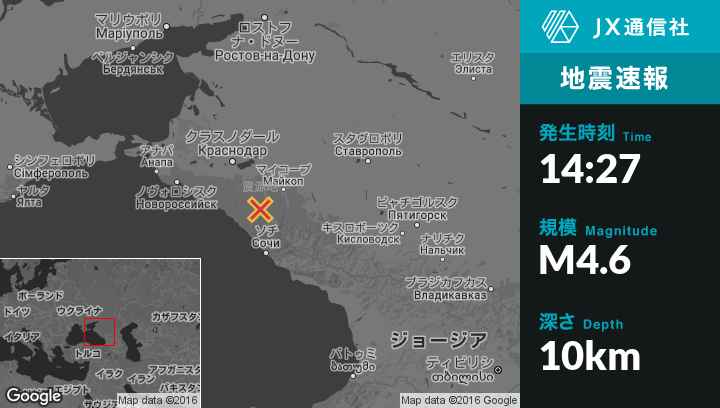 10月30日 14:27頃、ロシアのKhadyzhenskから南東7kmの地点でM4.6の地震がありました。