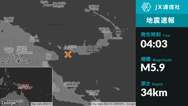 11月02日 04:03頃、パプア ニューギニア独立国のFinschhafenから東北東100kmの地点でM5.9の地震がありました。