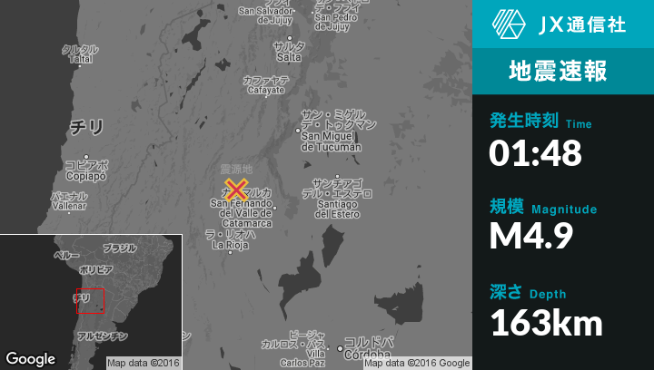 | 震源地 | アルゼンチンのBelenから南東48kmの地点 |