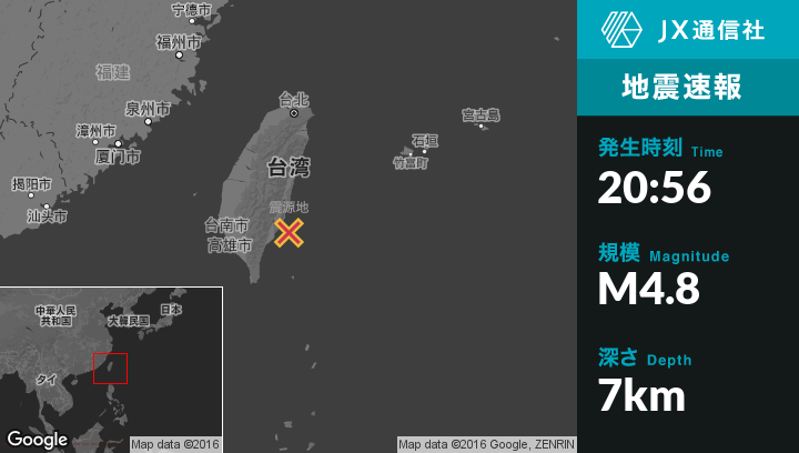 11月07日 20:56頃、台湾のTaitung Cityから北東40kmの地点でM4.8の地震がありました。