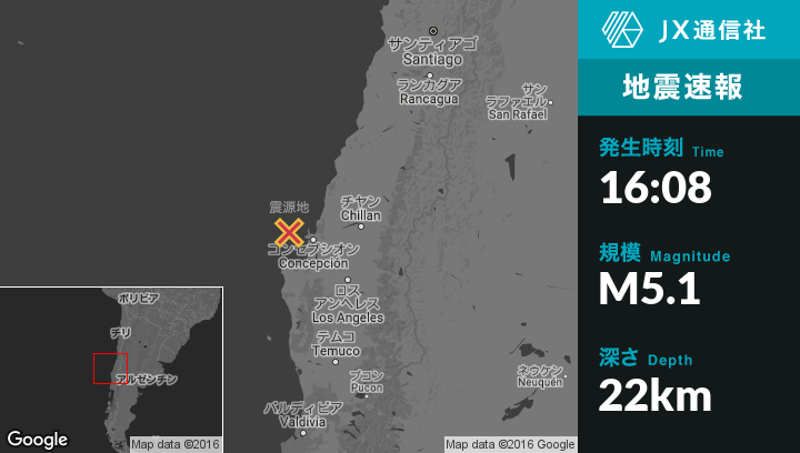 11月08日 16:08頃、チリのTalcahuanoから西北西38kmの地点でM5.1の地震がありました。