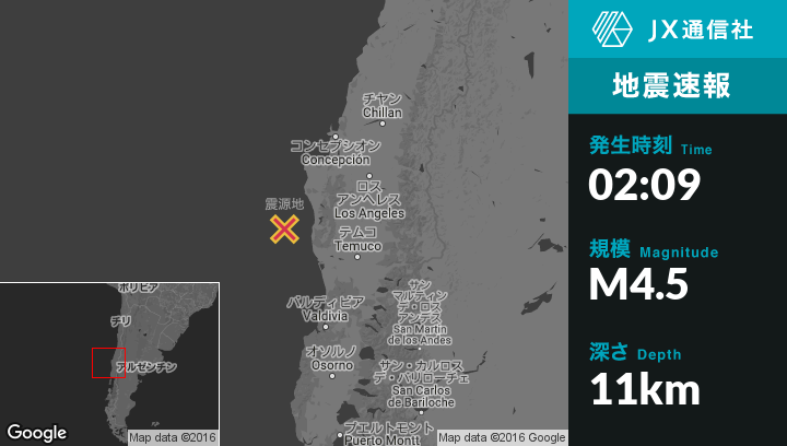 11月09日 02:09頃、チリのCaneteから南西73kmの地点でM4.5の地震がありました。