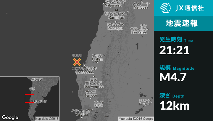 11月09日 21:21頃、チリのTalcahuanoから西北西49kmの地点でM4.7の地震がありました。