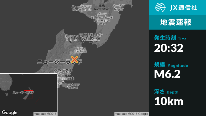 11月13日 20:32頃、ニュージーランドのKaikouraから北西28kmの地点でM6.2の地震がありました。