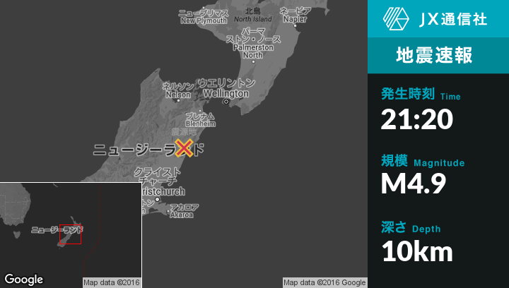 11月13日 21:20頃、ニュージーランドのKaikouraから北西23kmの地点でM4.9の地震がありました。