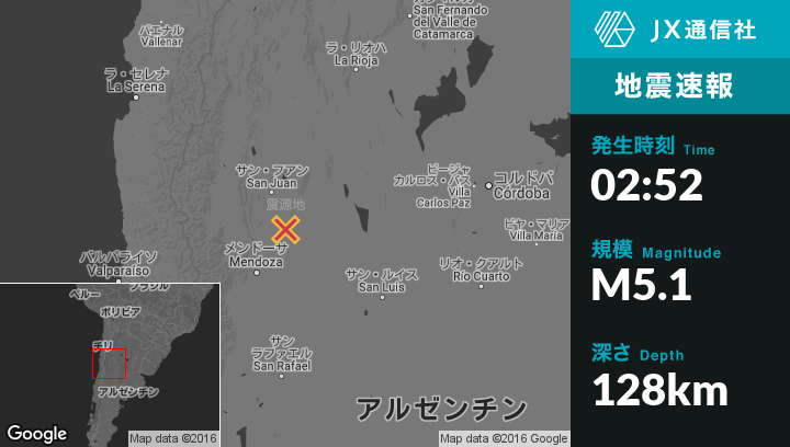 | 震源地 | アルゼンチンのCauceteから南45kmの地点 |