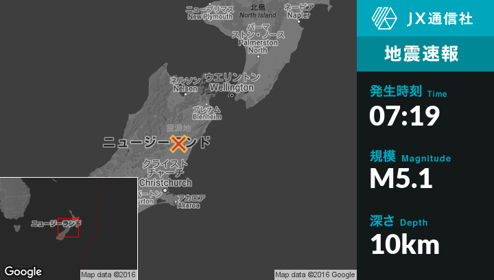| 震源地 | ニュージーランドのKaikouraから西51kmの地点 |