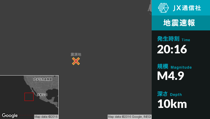 11月14日 20:16頃、メキシコのClarion Islandから北西460kmの地点でM4.9の地震がありました。