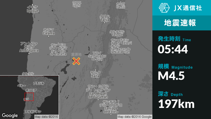 | 震源地 | アルゼンチンのSan Antonio de los Cobresから西北西57kmの地点 |