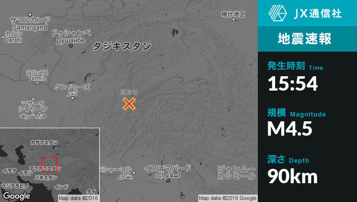 11月18日 15:54頃、アフガニスタンのAshkashamから西南西16kmの地点でM4.5の地震がありました。