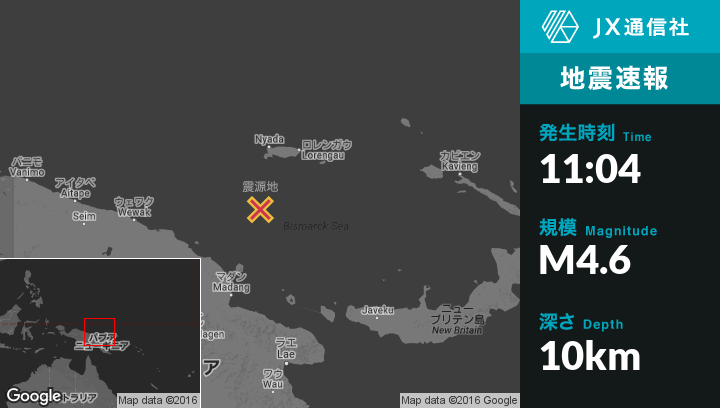 11月20日 11:04頃、パプア ニューギニア独立国のLorengauから南西163kmの地点でM4.6の地震がありました。