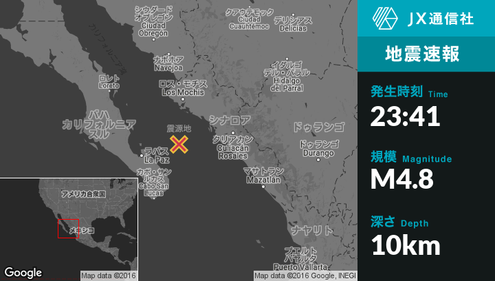 11月20日 23:41頃、メキシコのTopolobampoから南112kmの地点でM4.8の地震がありました。