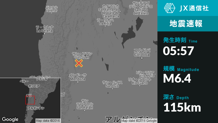 | 震源地 | アルゼンチンのZondaから南南西10kmの地点 |