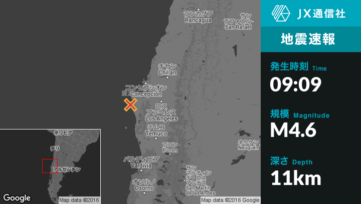 11月21日 09:09頃、チリのLebuから北北西16kmの地点でM4.6の地震がありました。