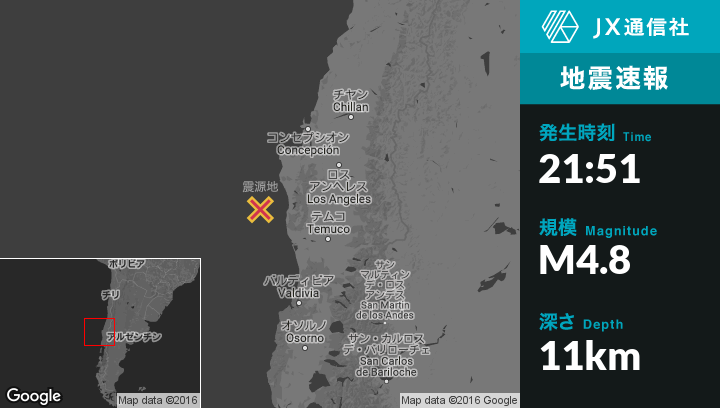 11月21日 21:51頃、チリのLebuから南西69kmの地点でM4.8の地震がありました。