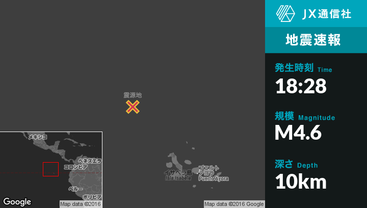 11月24日 18:28頃、エクアドルのPuerto Villamilから北北西425kmの地点でM4.6の地震がありました。