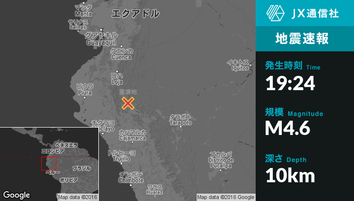 12月07日 19:24頃、ペルーのSan Ignacioから東南東36kmの地点でM4.6の地震がありました。