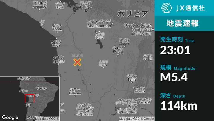 12月25日 23:01頃、チリのIquiqueから東147kmの地点でM5.4の地震がありました。