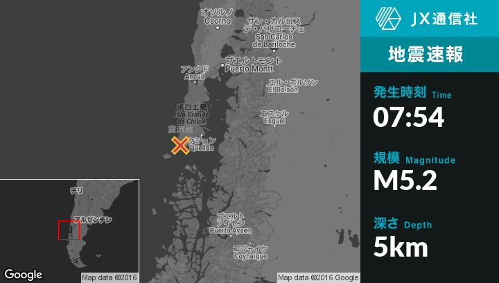 | 震源地 | チリのPuerto Quellonから西南西56kmの地点 |