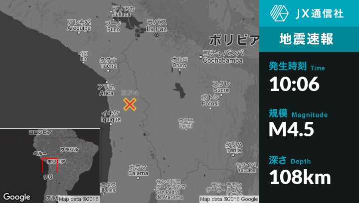 12月28日 10:06頃、チリのPutreから南南東124kmの地点でM4.5の地震がありました。