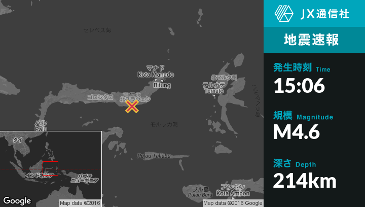 12月30日 15:06頃、インドネシアのMolibaguから西北西18kmの地点でM4.6の地震がありました。