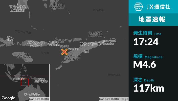 12月30日 17:24頃、インドネシアのNaisano Duaから北北西45kmの地点でM4.6の地震がありました。