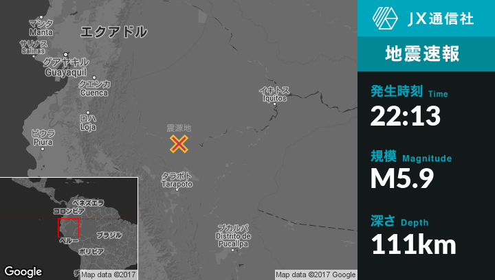 1月02日 22:13頃、ペルーのBarrancaから東43kmの地点でM5.9の地震がありました。