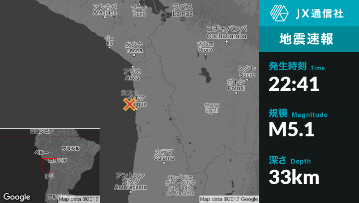 1月03日 22:41頃、チリのIquiqueから北西43kmの地点でM5.1の地震がありました。