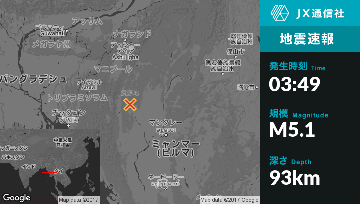 | 震源地 | ミャンマーのMawlaikから南南東38kmの地点 |
