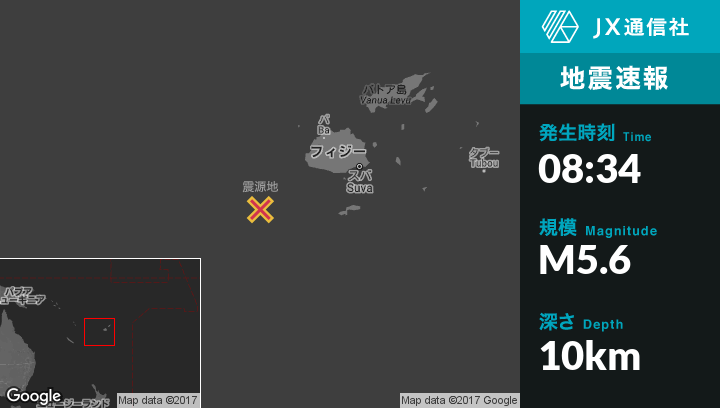 1月04日 08:34頃、フィジーのNadiから南西174kmの地点でM5.6の地震がありました。